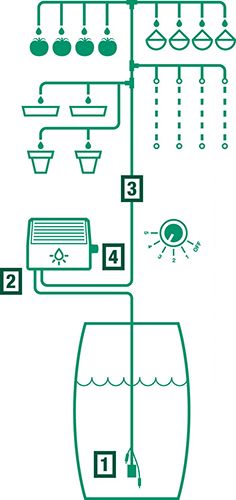 Vďaka solárnej energii môže byť voda a (tiež) doplnkové živiny čerpané priamo z vášho rezervoáru. Žiadne káble ani vodovodné potrubie nie sú potrebné - systém pracuje úplne nezávisle na prívode elektrickej energie alebo vody - už žiadne nosenie ťažkých krhiel!