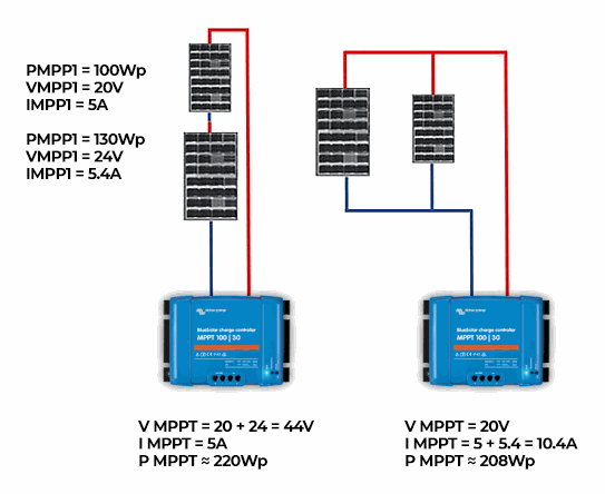 Sériovo - Pri takomto spojení rôznych panelov sa spočíta napätie oboch panelov, ale prúd oboch sa prispôsobí tomu slabšiemu. Vhodné riešenie pri paneloch s rôznymi napätiami, no podobnými prúdy.